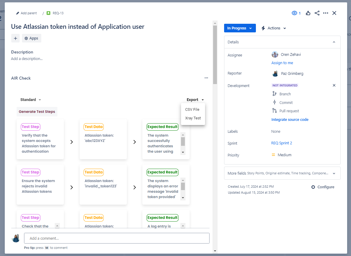 AIR Check collects the context from the Jira issue, including summary, description and linked issues. The data is passed to a chain of interactions with various Open AI models to infer the testable aspects of the Jira issue, and then create a test flow for it.