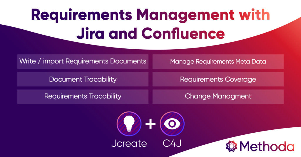 Methoda implements simple to highly-complex Requirements Management solutions based on the Atlassian platform – Jira, Confluence and Bitbucket. The ability to connect requirements at different levels (MRD, PRD, SYSTEM, HW/SW….) to your implementation/development tasks, tests and test executions, releases and delivery cycle – provides a new way to implement agility while maintaining traceability, tracking, and compliance.